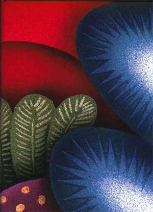 White alum-tawed goatskin, design painted and spattered through stencils, gold tooling. Hand sewn on linen tapes with hand-sewn headbands and leather jointed edleaves. Hand-painted monochrome doublures.